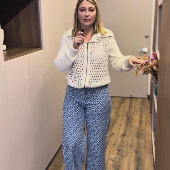Esta chaqueta tejida está diseñada para convertirse en tu favorita. Su espalda y mangas en tejido completo aportan estructura, mientras que el frente, con delicados detalles calados, le da un toque único. ¿Y el cuello? Un detalle que eleva su estilo. Confeccionada 100% en algodón, es la combinación perfecta de comodidad y diseño. ¡No te la pierdas!